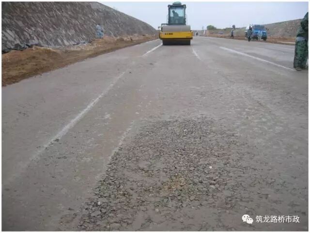 (2)层铺法施工时,上下层间有浮土或因潮湿而形成隔层,表层被行车推移。