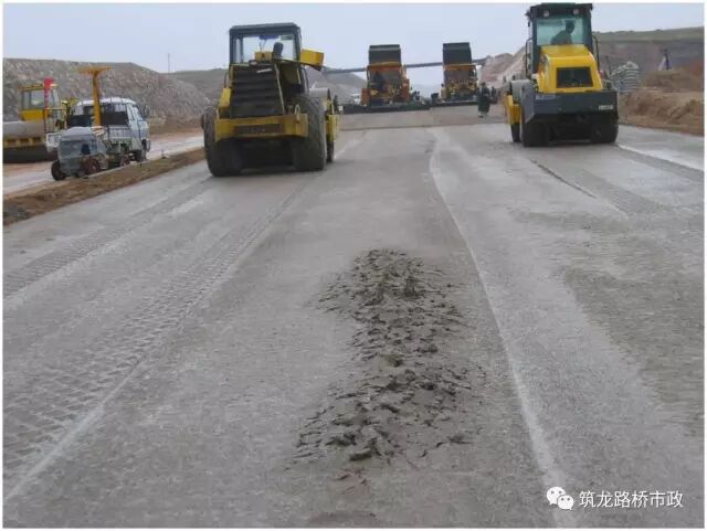 (9)当水泥稳定基层在高温碾压时,易出现表面干燥而失水现象,碾压时,振动碾和三钢轮压路机正常碾压,胶轮压路机碾压前先用喷雾式洒水车补水,再用胶轮碾压。